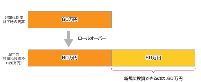 120万円以下をロールオーバーした場合、その差額が翌年に可能な投資額となります。例えばロールオーバーする金額が60万円だった場合、翌年新しく投資できる額は「120-60=60」で60万円までになります。