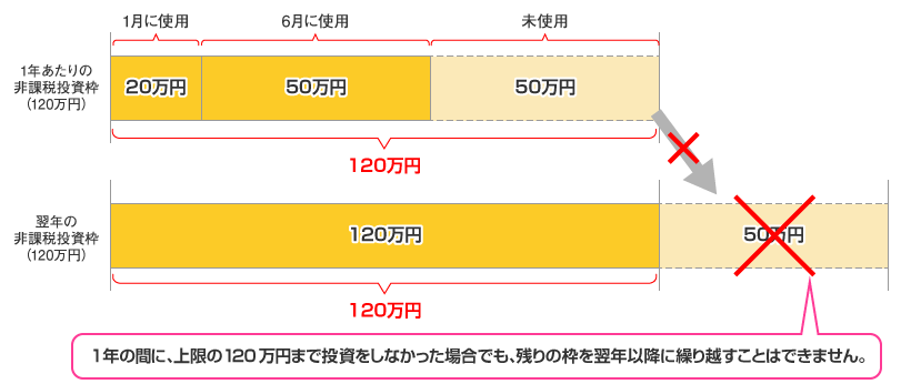 もし120万円未満の投資をしたとしても、残金を翌年の投資額に繰り越すことはできません。つまり、今年の投資額が70万円だったとしても、来年の投資上限額が170万円になるわけではなく、来年の投資額も120万円までということになります。