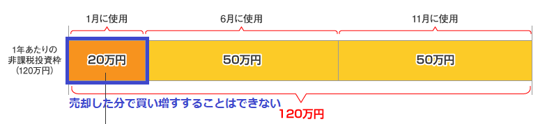 つまり上限の120万円を投資して、そのうち20万円を売却しても、その年にそれ以上株やETFをNISA口座から買い増すことはできません。