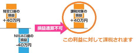 つまり、一般口座で利益を40万円出したけどNISA口座で損失が40万円あった場合、損益通算して利益をゼロにして、一般口座の利益の40万円を非課税にするということはできません。