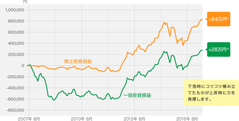 上のグラフでも、一括投資した場合よりも、時間分散投資の方が全体的に利益を生みだしていることがわかります。これは時間分散投資によって、購入単価が低く抑えられているためです。