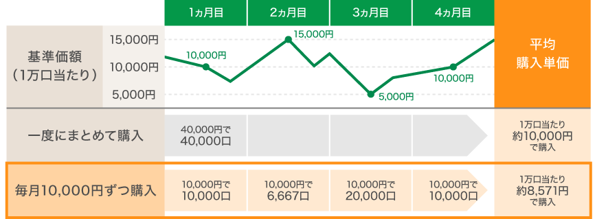 投資対象の価格の変動に関わらず、一定の金額を時間を分散しながら定期的に購入し続ける投資方法です。