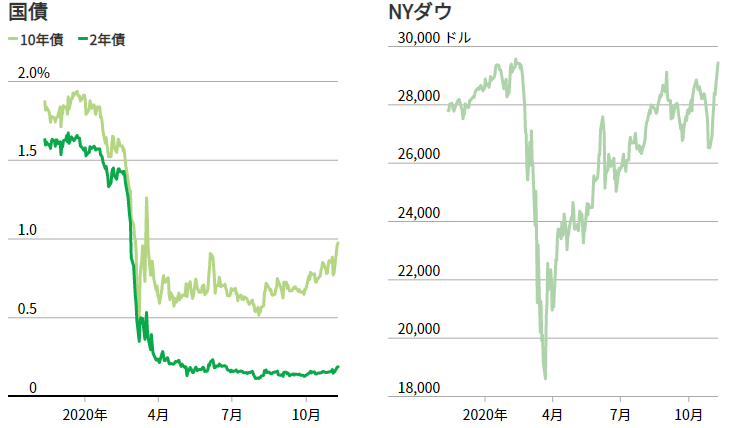 こちらは2020年の米国債とNYダウの株価推移を比較したものです。