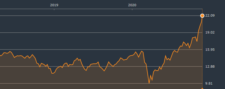 11月24日現在で22.08ドルの過去高値を記録しています。